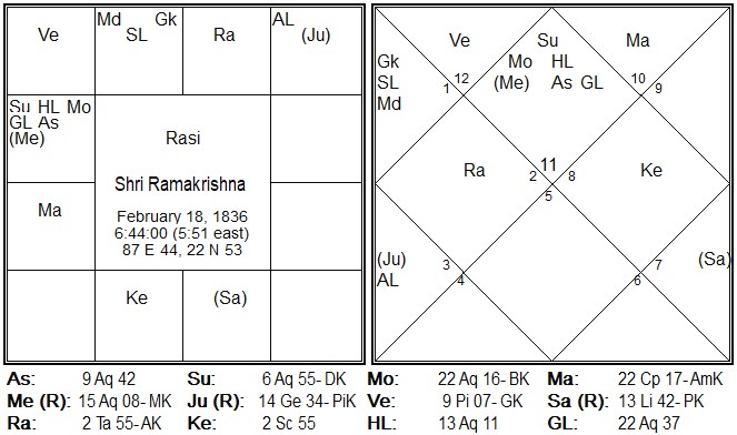As per the Birth Details of Saint – Ramakrishna Paramahansa, Date: 18 Feb 1836, Time: 6:44 am and Place of Birth: Kamarpukur, West Bengal, India the Chart is as follows as I have casted on Parashara Light.