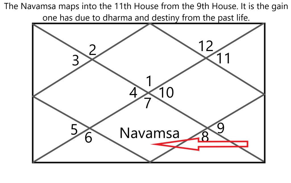 The Navamsa 11th house is a very peculiar house, it can be good or bad. It shows our Maya, the illusion of life, what we love and what can also punish us. Benefics here can cause Financial Gains and Income. Dasa of the Planets in the 11th house can cause marriage also. Malefics here can cause serious suffering and punishment. The nature of the 11th house as a house of gains and punishment is very peculiar. This nature comes from the concept of Bhavat Bhavam.