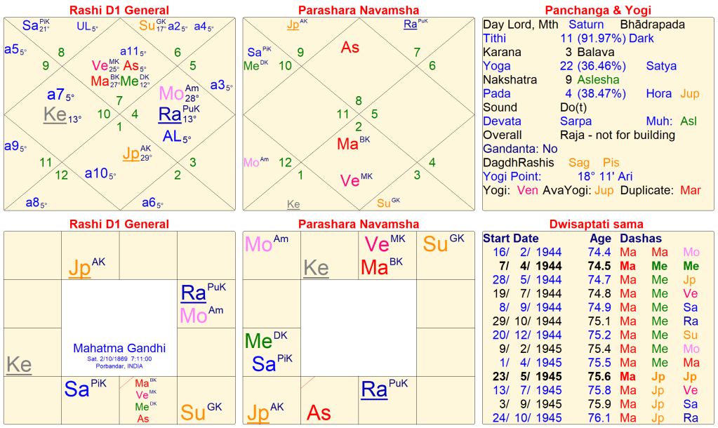 Mahatma Gandhi married Kasturba Gandhi on May 1883. The Dasa that was running during the time was Mercury>Venus>Mars. As you can check Mercury being the Dara Karaka is having Rashi Dristi on the 7th house, and Venus is the 7th lord in the Navamsa 7th house with Mars. Check the 7th house carefully Venus in Taurus with Mar, Kasturba Gandhi was a very strong-willed woman who faced all the challenges along with her husband and never complained.