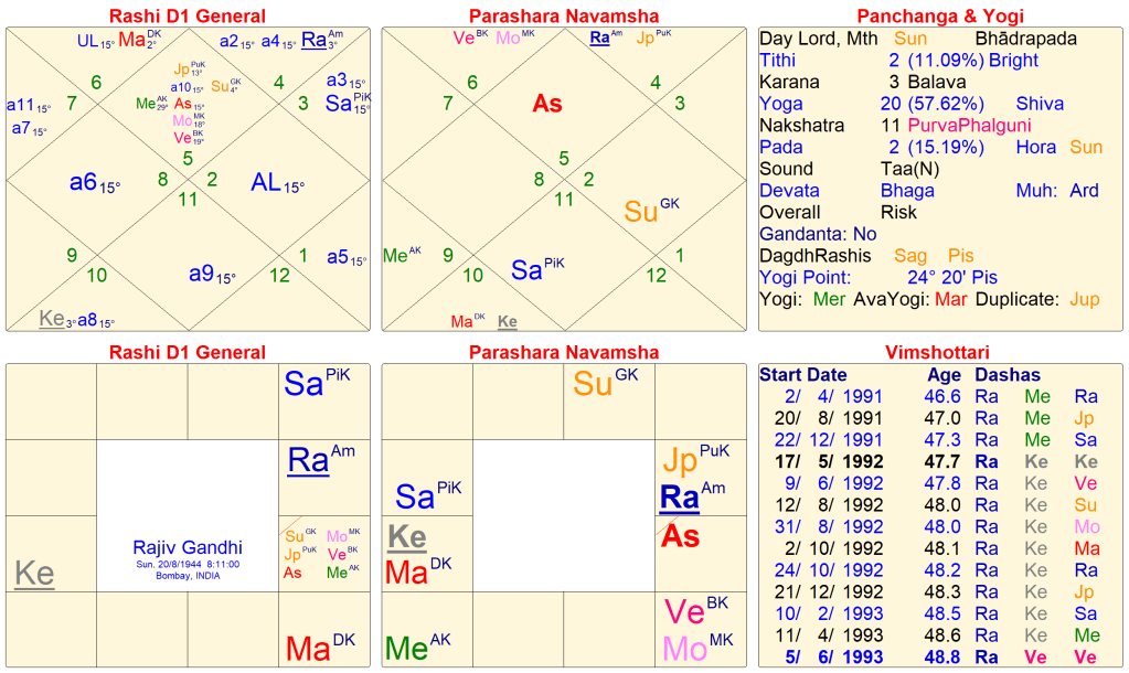 Shri Rajiv Gandhi has Guru Chandal Yoga (Jupiter+Rahu) in the Navamsa 12th house. Rahu shows explosives and bombs. Check carefully Rahu is in exchange with Moon. A lady bomber carried the act. Now check the Dasa also on 21 May 1991, it Rahu>Mercury>Rahu, both are Marakas in the Rashi chart and Rahu is in the 12th house of Jeevan Mukta in Navamsa.