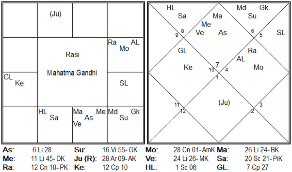 The Lagna is Tula with Venus, Mercury and Mars in the Lagna. Venus is its Sign making a Mahavalya Maha Purusha Yoga. Mercury is in full digbala. He detested violence (Mars) and chose the path of nonviolence (Mercury). This got him undying fame. AL is in Cancer with Moon and Rahu. Moon is public and they followed with like anything. Rahu in AL gives personality which can know many things.
