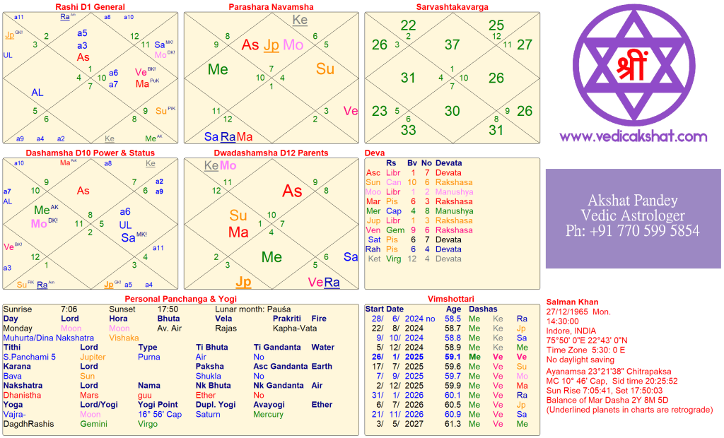 Salman Khan is a famous Bollywood actor. He is famous for his body and action movies. We see that the lagna lord is exalted with Venus. AL is in Cancer but Capricorn is much stronger so it will function as AL. Mars and Venus show action movies with the influence of Saturn shows body. Mercury and Rahu are also having Rashi dristi. Mercury will show acting and Rahu will show some controversies related to Venus (Females and Cars) and wild animals (Rahu rules Pashu).