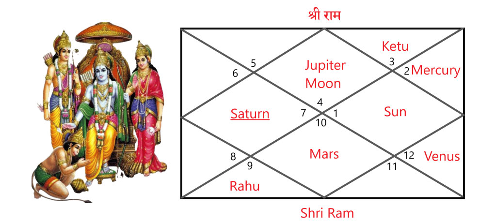 In the chart of Prabhu Shri Ram, we see Lagna has Exalted Jupiter and Lagna Lord Moon in his own sign. Jupiter is also the 9th lord of Dharma and the 6th Lord of enemies and fighting. He is known for upholding dharma and defeating his enemies. The AL is in the 10th house of Aries with the exalted Sun. He is the king of kings with all his glory even today.